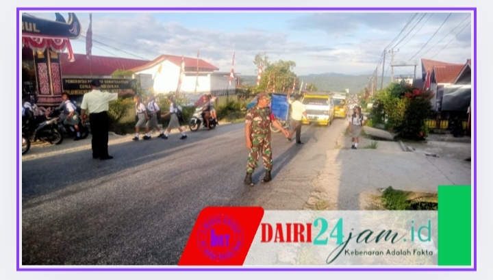 DAIRI24JAM – Babinsa Koramil 01/ Sbl Kodim 0206/Dairi Sertu WP Togagorop membantu menyeberangkan murid Sekolah Menengah Atas Negeri 1 Sumbul yang berlokasi di Jl. Lintas Sidikalang Medan,Kecamatan Sumbul Kabupaten Dairi ,kamis (11/06/2025).