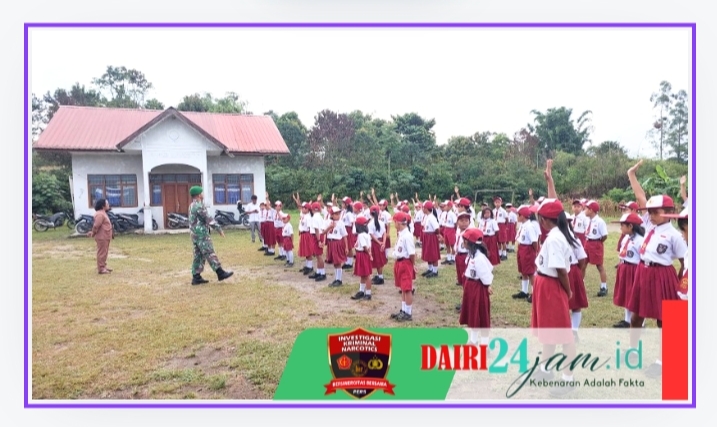 Dairi24jam | Sumbul – Berlokasi dihalaman SD Negeri 030349 Parbuahan, Serda. JR Simamora selaku Babinsa Koramil 01/ Sumbul jajaran Kodim 0206/ Dairi memberikan materi wawasan kebangsaan dan cinta tanah air kepada Siswa siswi baru SD Negeri 030349 Parbuahan, Kecamatan Sumbul, Kabupaten Dairi – Sumut.