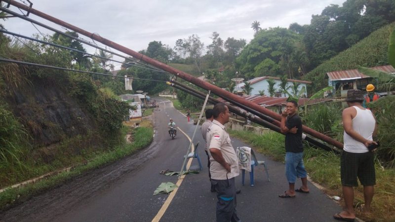 Dengan ini Babinsa 05/TP Sertu Hasanadi mengajak warga desa binaan bersama sama ikut serta dalam menangani masalah Tiang listrik tumbang ke bahu jalan.
