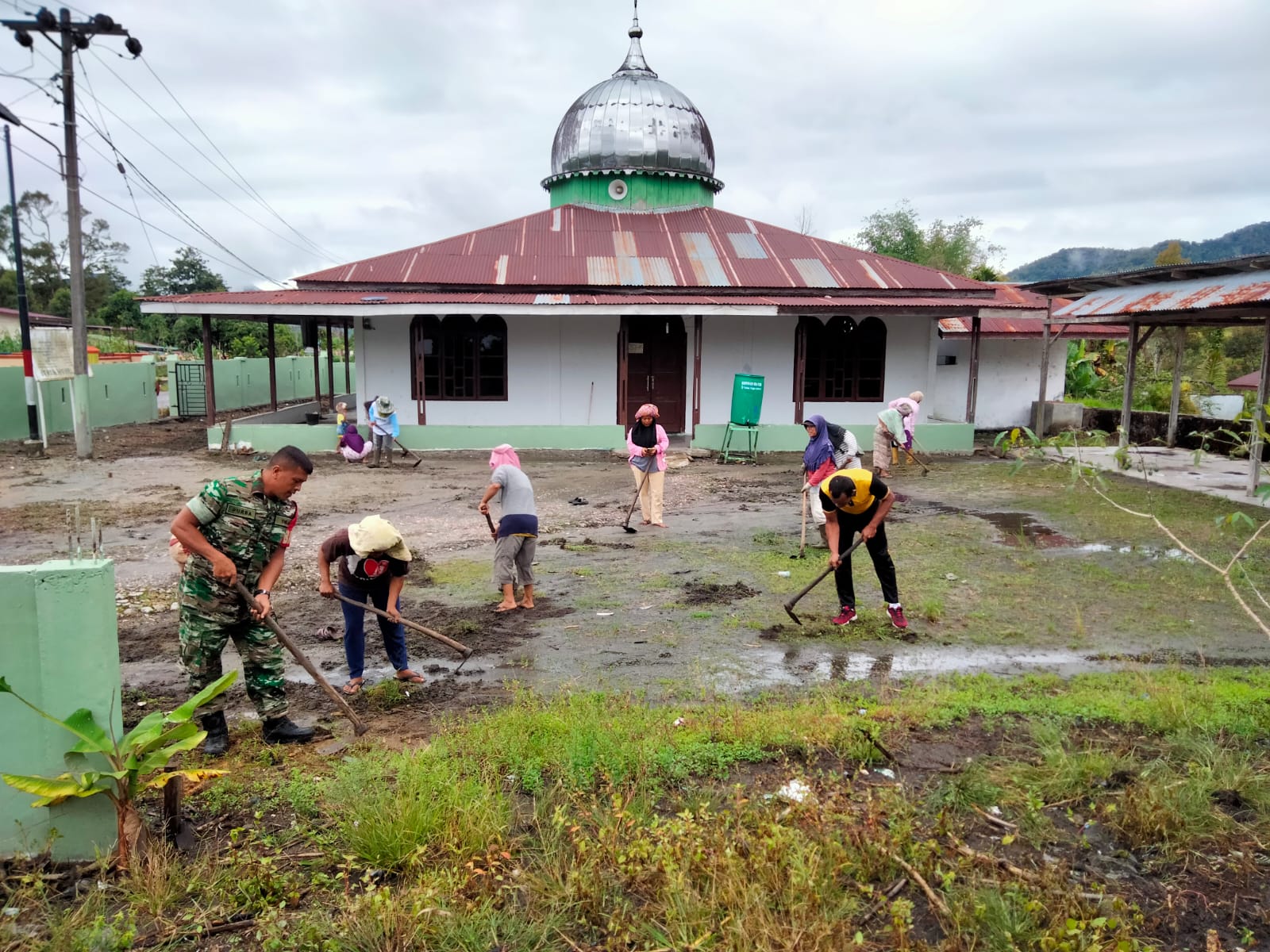 Dairi24jam|| Pakpak Bharat—Babinsa Koramil 07/Salak Kodim 0206/Dairi Sertu J.Purba bersama warga melaksanakan gotong royong membersihkan halaman Masjid Ainul yaqin di Desa Silima Kuta Kec.Sitellu Tali Urang Julu, kab.Pakpak Bharat Jum’at (07/04/2023).
