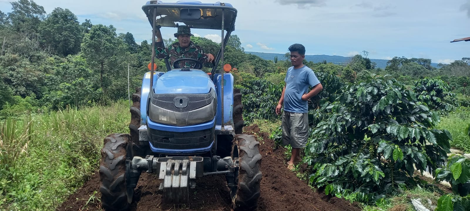 Babinsa Koramil 01 Sumbul Bantu Petani Olah Lahan Menggunakan Alsintan Traktor Roda 4