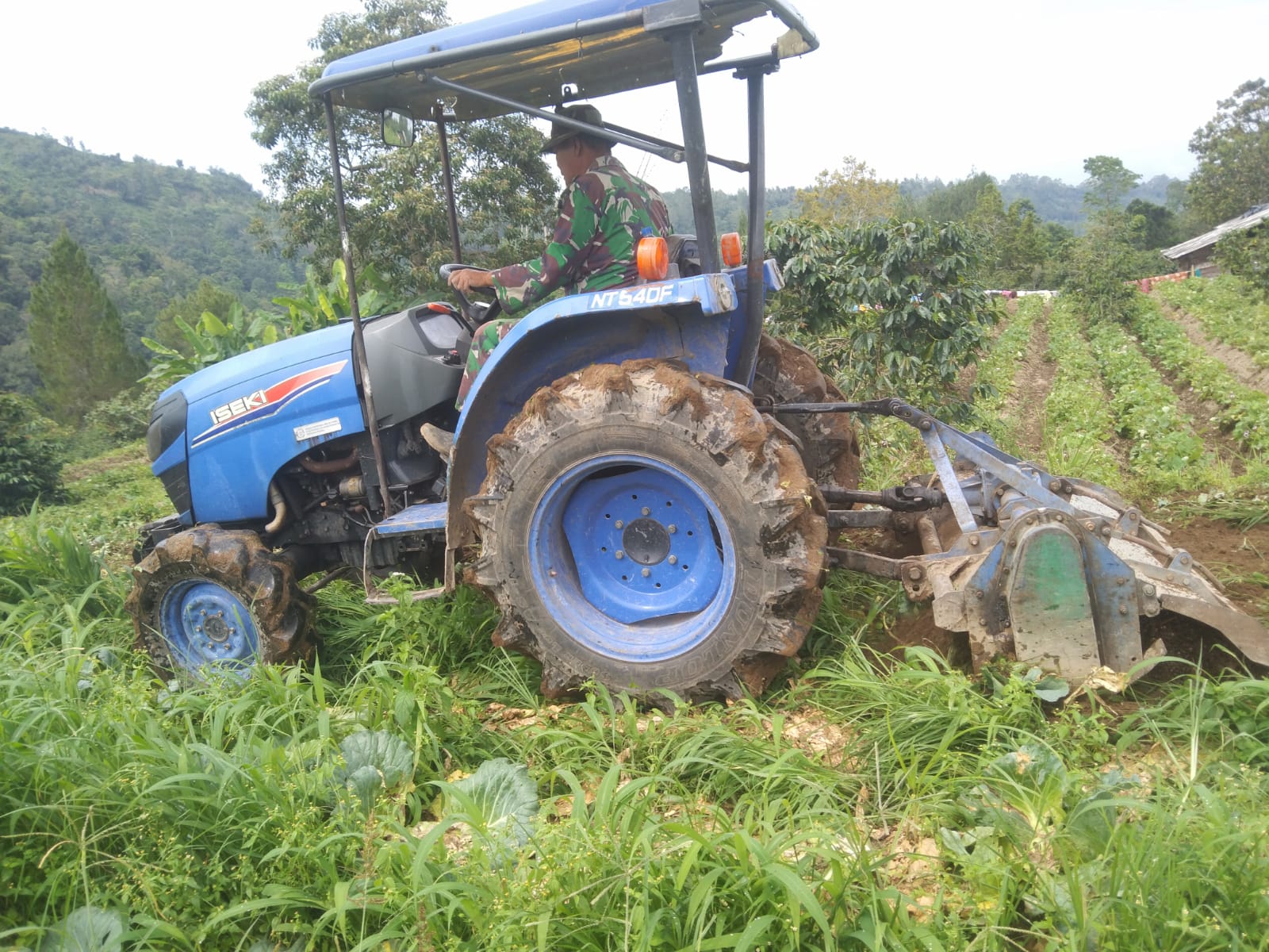 Babinsa Koramil 01 Sumbul Bantu Petani Olah Lahan Menggunakan Alsintan Traktor Roda 4