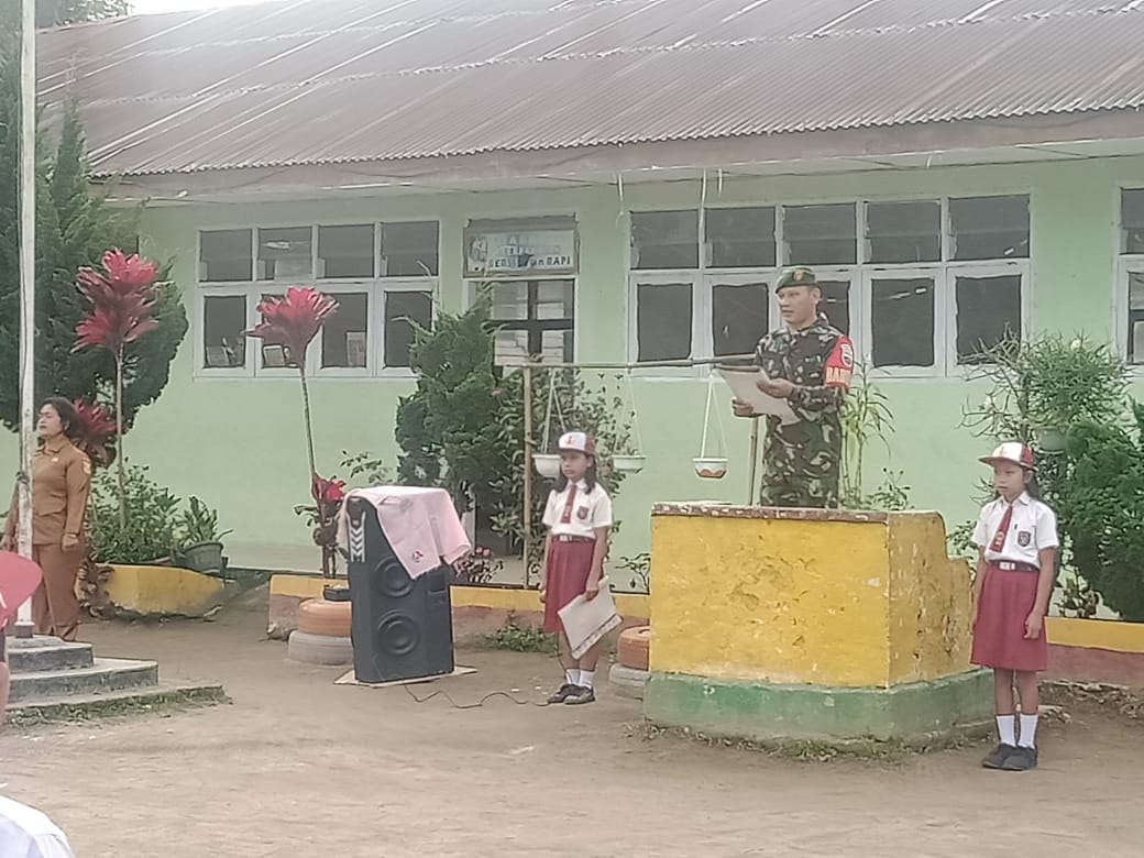 Dairi24jam || Sumbul–Babinsa Koramil 01/Sumbul Kodim 0206/Dairi Sertu Adiramon Ginting mengajarkan materi wawasan kebangsaan saat menjadi Pembina Upacara kepada siswa Sekolah Dasar Negeri 030345 Desa Hutagunggung Kecamatan Sumbul Kabupaten Dairi,Senin (09-01-2023).