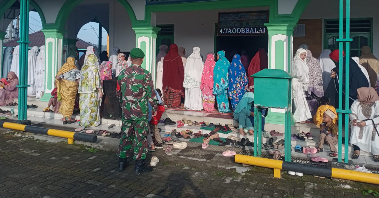 Dairi24jam || Sumbul –Babinsa Koramil 01/Sumbu Serda Jasa Ranto Simamora bersama anggota Polsek Sumbul nelaksanakan pengamanan Sholat Idul Fitri 1444 H di Mesjid Al -Ikhlas Sunbul,Sabtu (22/04/2023).