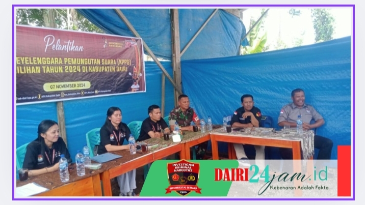 Dairi24jam | Sumbul – Babinsa Koramil 01/ Sumbul jajaran Kodim 0206/ Dairi, Sertu Adiramon ginting menghadiri kegiatan pelantikan Kelompok Penyelenggara Pemungutan Suara di Desa Pegagan Julu V, Kecamatan Sumbul, Kabupaten Dairi – Sumut, Kamis (7/11/2024).