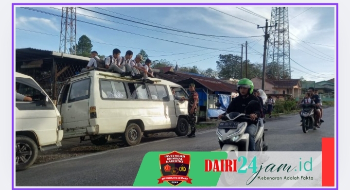 Dairi24jam | Sumbul – Babinsa Koramil 01/ Sumbul, Serda Rejeki Sinaga yang sedang dalam perjalanan untuk melaksanakan tugas sehari harinya selaku Babinsa sengaja berhenti ditengah jalan disekitaran Kecamatan Sumbul, Kabupaten Dairi – Sumut, melihat beberapa angkutan yang membawa penumpang anak anak sekolah melebihi muatan, Rabu (13/11/2024).