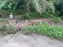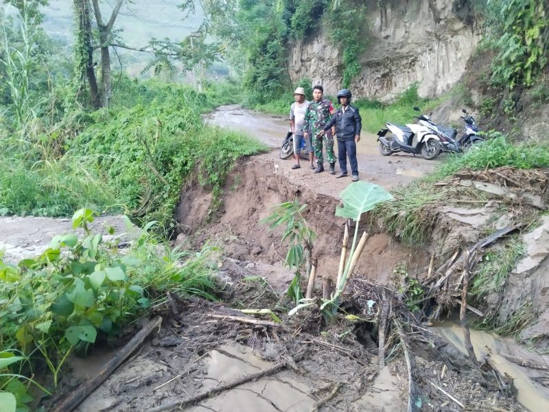 Dairi24jam || Tanah Pinem—Babinsa Koramil 05 Tanah Pinem Praka Teguh Berutu memantau tanah longsor yang terjadi pada Senin sekitar Pukul 16.50 wib, di jalan Desa pengubung Mangan Molih dengan desa lae njuhar di Kecamatan Tanah Pinem,Kabupaten Dairi , Senin (23-10-2023)..
