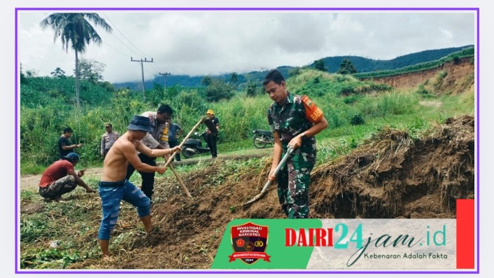 Dairi24jam | Tanah Pinem – Babinsa Koramil 05/ Tanah Pinem jajaran Kodim 0206/ Dairi, Kopda Baihaki tampak semangat melaksanakan gotongroyong bersama warga masyarakat membersihkan badan jalan Gerbang masuk Desa Renun, Kecamatan Tanah Pinem, Kabupaten Dairi – Sumut, Rabu (20/11/2024).
