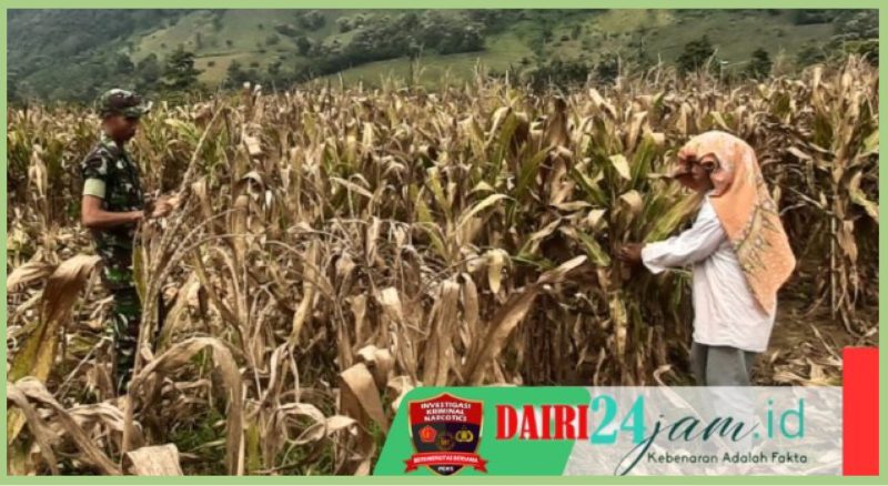 Dairi24jam | Dairi – Babinsa Koramil 05/ Tanah Pinem jajran Kodim 0206/ Dairi, Kopda. Jamilul melaksanakan pendampingan kepada petani dalam memanen jagung milik Tasya br Maha di Desa Pasir Tengah, Kabupaten Dairi – Sumut, Minggu (1/12/2024).