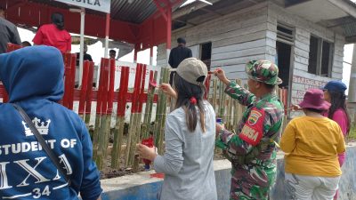 Dairi24jam || Tinada—Babinsa Koramil 06/Kerajaan Serda Rudy Limbong Bersama mahasiswa KKN Unimed kerja bakti mengecat pagar pos Keamanan Lingkungan (Pos Kamling) yang terletak di Desa Tinada , Kecamatan Tinada, Kabupaten Pakpak Bharat, Sabtu (22/07/2023).