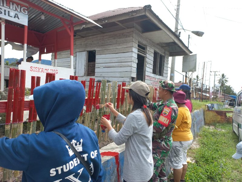 Dairi24jam || Tinada—Babinsa Koramil 06/Kerajaan Serda Rudy Limbong Bersama mahasiswa KKN Unimed kerja bakti mengecat pagar pos Keamanan Lingkungan (Pos Kamling) yang terletak di Desa Tinada , Kecamatan Tinada, Kabupaten Pakpak Bharat, Sabtu (22/07/2023).