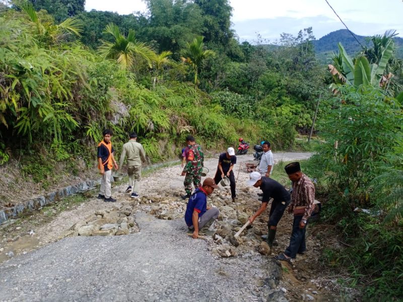 Babinsa Koramil 06 Kerajaan Bersama Warga Gotong Royong Menimbun Jalan Berlubang