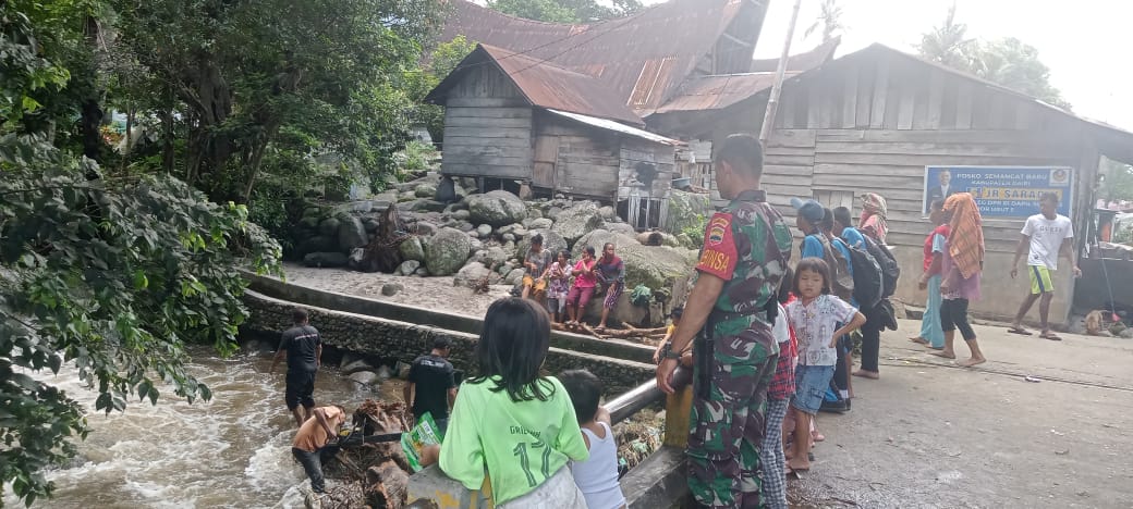 Dairi24jam || Sumbul – Saat memonitor kondisi di wilayah binaan, Serda Eriston Simbolon Babinsa Koramil 01/Sbl Kodim 0206/Dairi mengimbau kepada warga setempat agar tetap waspada, meski saat ini banjir luapan air sungai beberapa hari yang lalu sudah surut di Desa paropo,Minggu (28/01/2024).