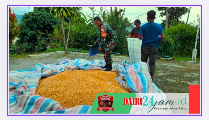 DAIRI24JAMSertu Karnadi Babinsa Koramil 06/Kerajaan jajaran Kodim 0206/Dairi membantu Warga menjemur jagung milik warga desa binaan ,Di Desa Sukaramai ,Kecamatan Kerajaan ,Kabupaten Pakpak Bharat-Sumut ,Rabu (19-02-2025)..