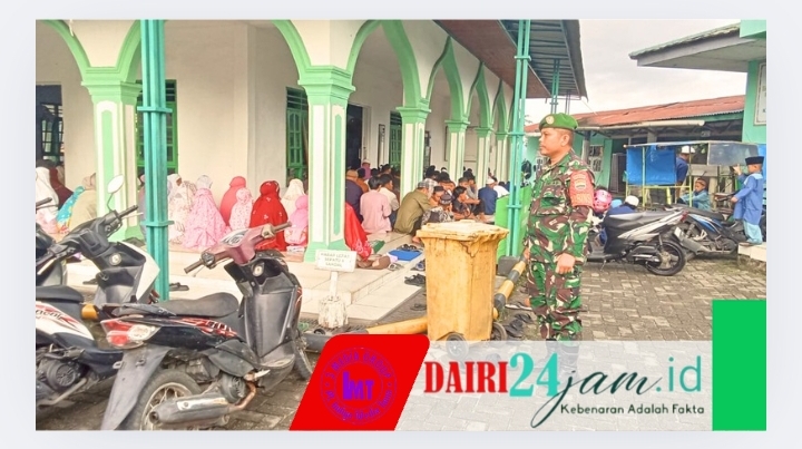 DAIRI24JAMBabinsa Kelurahan Sumbul Koramil 01/sumbul Kodim 0206 /Dari Koptu Boslan Padang bersama tiga pilar melaksanakan kegiatan pengamanan Sholat Idul Fitri 1446 Hijriah bertempat di Masjid Al-Iklas Sumbul di Jl. S.M Raja sumbul yang diikuti ± 300 jama’ah dan selaku Imam dan Khotib Ustadz Abdul Hamid lingga . Senin (31/03/2025).