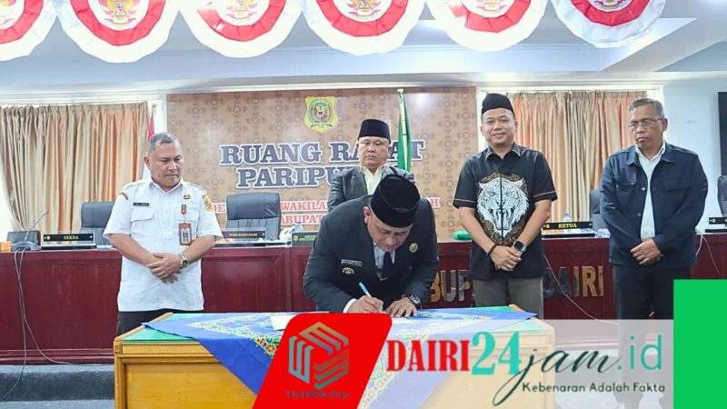 DAIRI24JAM || SIDIKALANG – Bupati Dairi Vickner Sinaga yang diwakili oleh Wakil Bupati Dairi Wahyu Daniel Sagala menyampaikan Laporan Keterangan Pertanggungjawaban (LKPJ) Tahun Anggaran 2025 dalam rapat paripurna DPRD Dairi, Rabu (22/4/2026). Rapat paripurna di pimpin oleh Ketua DPRD Dairi Sabam Sibarani yang di dampingi oleh Wakil Ketua DPRD Dairi Wanseptember Situmorang.