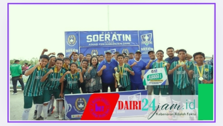DAIRI24JAMBupati Dairi, Ir Vickner Sinaga Bersama Wakil Bupati Dairi, Wahyu Daniel Sagala, menyerahkan secara langsung piala kepada para juara turnamen Soeratin Cup U-13 dan U-15 Kabupaten Dairi tahun 2025. Penyerahan tersebut dilangsungkan di Stadion Baru Panji Bako Kecamatan Sitinjo disaksikan oleh para peserta, pelatih, orang tua, serta jajaran pengurus Asosiasi Kabupaten (Askab) PSSI Dairi. Minggu, (22/06/2025)