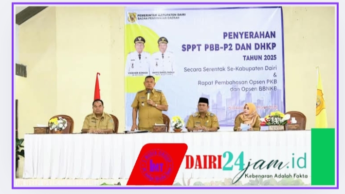 DAIRI24JAM —Bupati Dairi Ir. Vickner Sinaga dan Wakil Bupati Dairi Wahyu Daniel Sagala menghadiri Acara Penyerahan SPPT PBB-P2 dan DHKP (Surat Pemberitahuan Pajak Terhutang Pajak Bumi dan Bangunan Perkotaan dan Perdesaan, dan Daftar Himpunan Ketetapan Pajak), bertempat di Balai Budaya, Senin (24/03/2025).