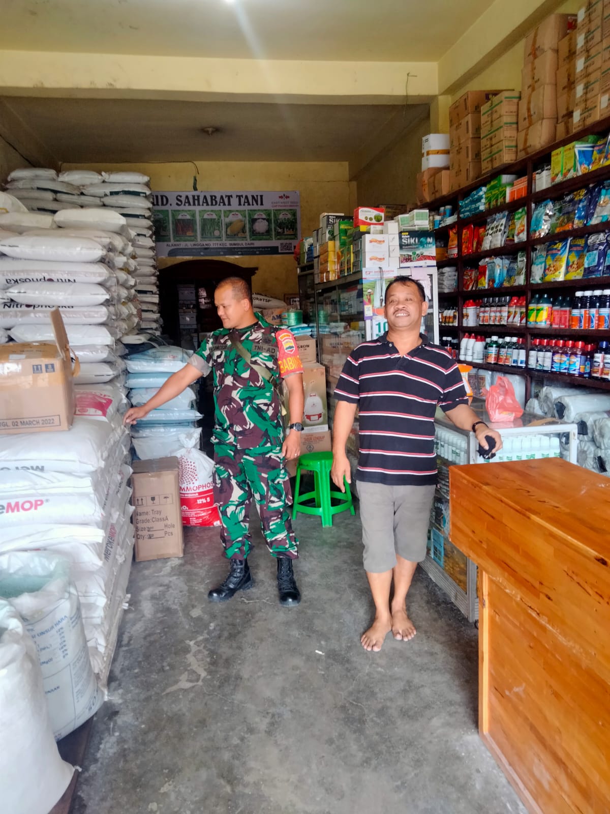 Dairi24jam || Sumbul Bintara Pembina Desa atau Babinsa Koramil 01/Sumbul Serda Torop Samosir melaksanakan pengecekan rutin akan ketersediaan pupuk bersubsidi yang berada disalah satu toko pupuk di kelurahan pegagan julu 1 Kecamatan Sumbul Kabupaten Dairi Senin (13/3 /2023).