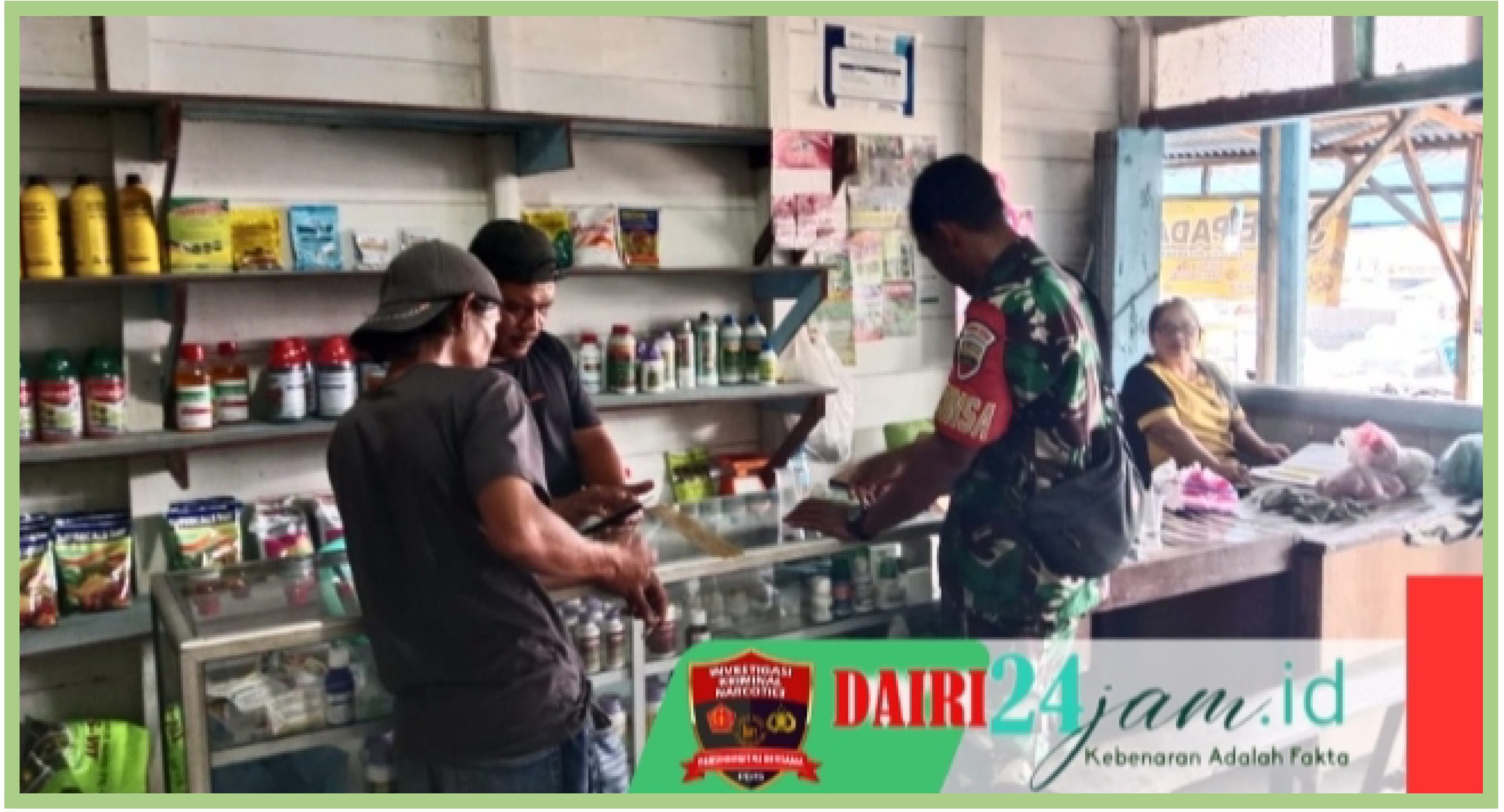 Dairi24jam – Bintara Pembina Desa atau Babinsa Koramil 06/ Kerajaan, Sertu. Haryoko melaksanakan pengecekan rutin akan ketersediaan pupuk dan obat pertanian yang berada disalah satu kios pupuk di Desa Sukaramai, Kecamatan Kerajaan, Kabupaten Pakpak Bharat – Sumut, Rabu (11/12/2024).