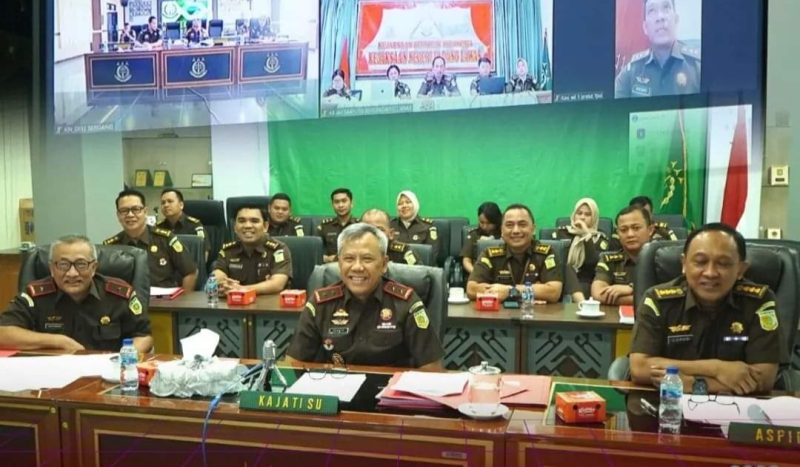 Kajati Sumut Idianto, SH,MH didampingi Wakajati Sumut Joko Purwanto, SH, Aspidum Luhur Istighfar, SH,M.Hum, Kabag TU, Koordinator, dan para Kasi menyampaikan ekspose perkara secara daring.