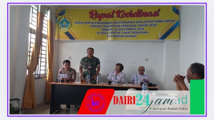 DAIRI24JAM — Perda Supriadi Danpos Koramil 06/Kerajaan dalam hal ini mewakili Danramil menghadiri rapat koordinasi terkait Penyelenggaraan Ketentraman dan Ketertiban Umum (TRATIBUM) yang dilaksanakan Di Aula Kantor Kecamatan Kerajaan, Kabupaten Pakpak Bharat-Sumut, Rabu (10-09-2025).