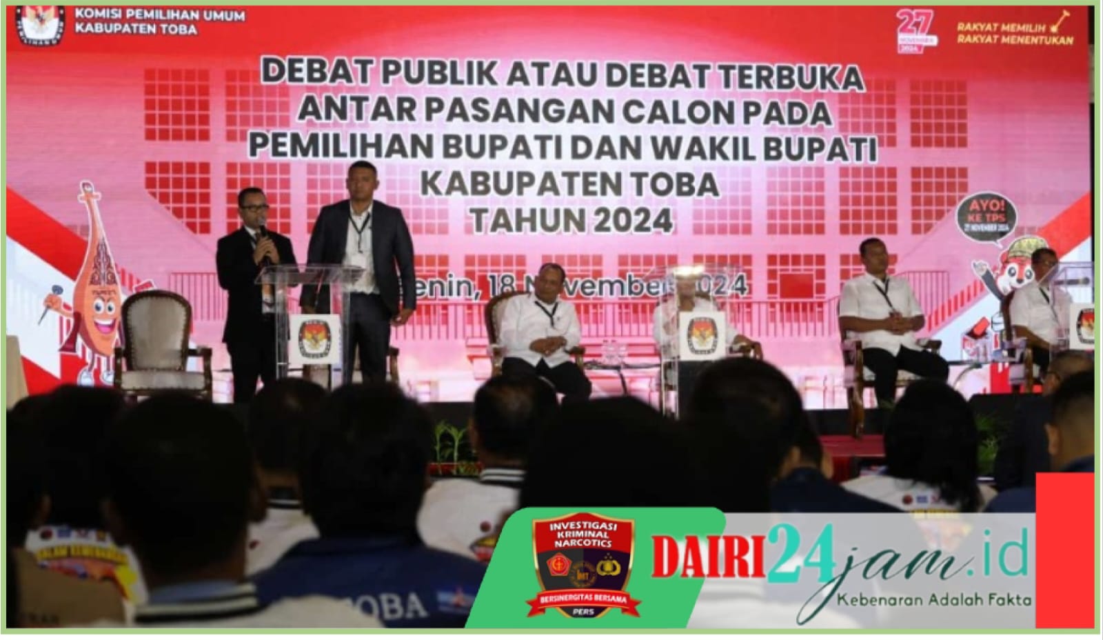 Dairi24jam | Medan – Debat publik Pemilihan Bupati dan Wakil Bupati Toba 2024 berlangsung lancar dan tertib di Hotel Emerald Garden, Jalan Putri Hijau, Medan. Pjs. Bupati Toba, Dr. Agustinus Panjaitan mengapresiasi Komisi Pemilihan Umum Daerah (KPUD) Toba atas penyelenggaraan debat yang sukses, serta kepada ketiga pasangan calon (paslon) yang menunjukkan kedewasaan berpolitik selama acara, Senin (18/11/2024).
