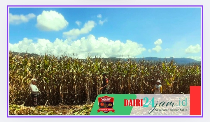 DAIRI24JAMBabinsa Koramil 05/Tanah Pinem Kopda Jamilul membantu petani untuk memanen jagung di lahan milik ibu Mery Tarigan, salah seorang petani warga desa binaan yang berada di desa Pasir Tengah ,Kecamatan Tanah Pinem ,Kabupaten Dairi-Sumut ,Selasa (18-02-2025)..