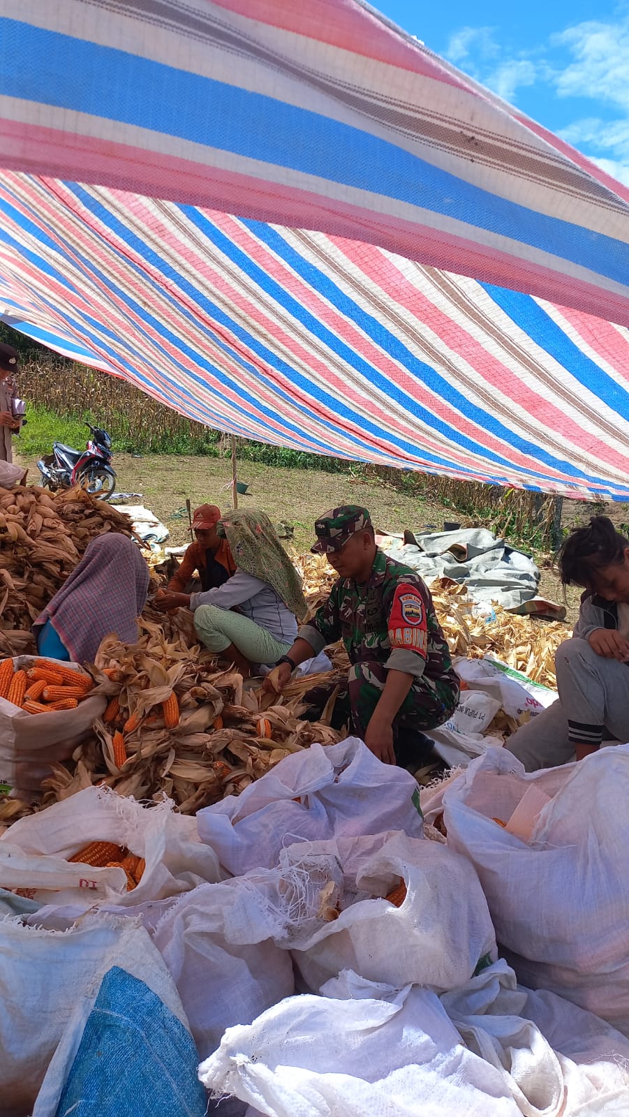 Sementara, di sela-sela kesibukan, Petani pemilik tanaman Jagung menyampaikan terima kasih dan apresiasi kepada Babinsa yang selalu mendampingi kelompok tani mulai dari penanaman hingga masa panen.