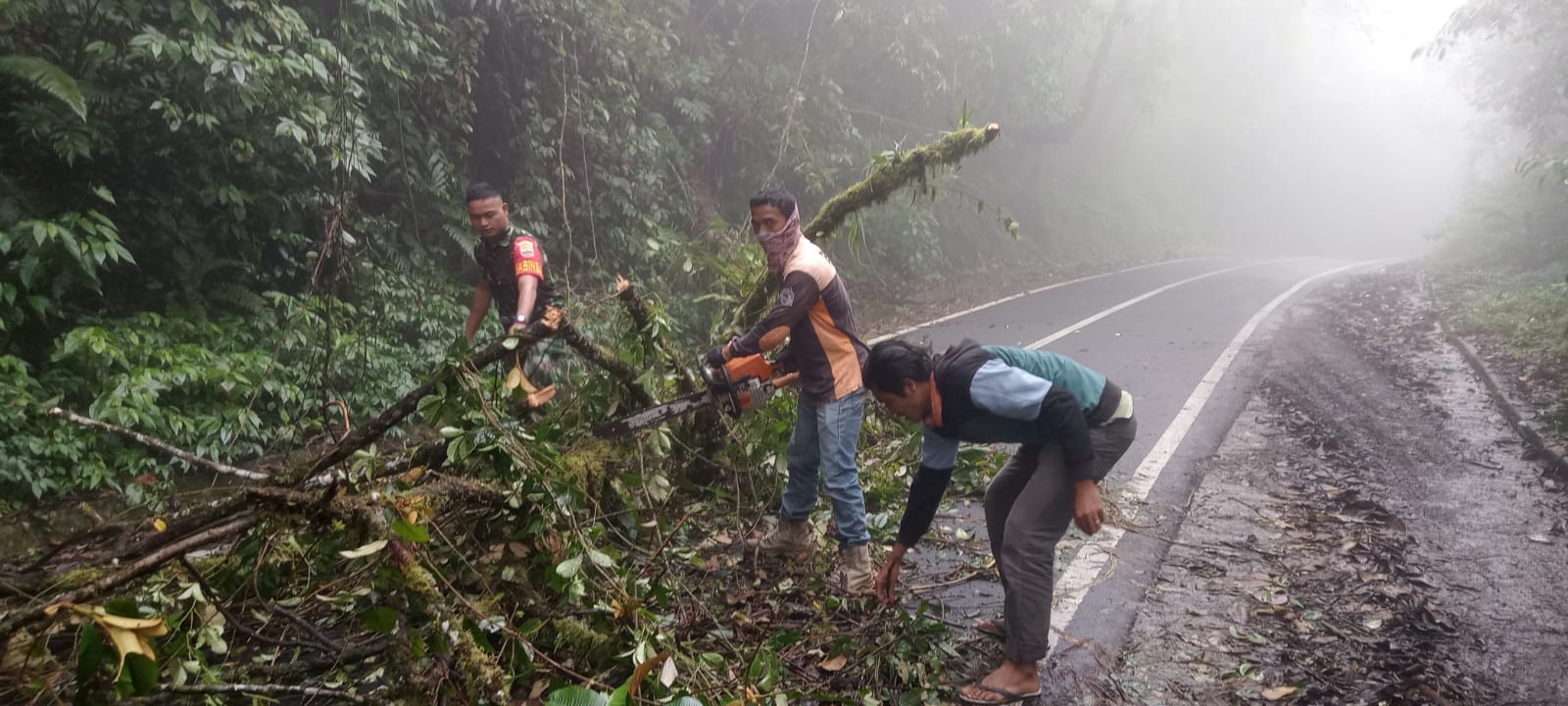 Pasca terjadinya hujan lebat yang disertai angin kencang mengakibatkan pohon tumbang jenis kayu pinus tersebut hingga menutup badan jalan sehingga arus lalu lintas maupun sebaliknya tidak bisa dilewati.