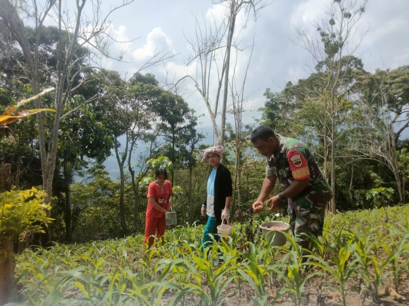 Pendampingan Babinsa kepada para petani jagung binaan terus aktif dilakukan, kali ini dalam proses pemupukan. Hal ini sebagai upaya Babinsa dalam mewujudkan peningkatan hasil panen tanaman jagung di wilayahnya demi kesejahteraan masyarakat.
