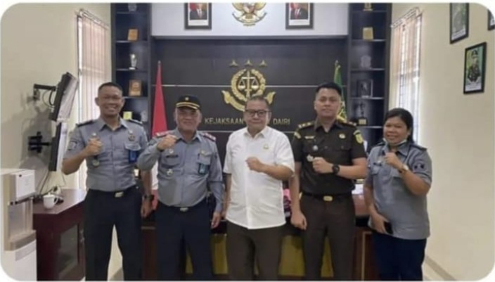 Dairi24jam||Sidikalang– Dalam rangka meningkatkan Koordinasi dan Sinergi antar Aparat Penegak Hukum(APH), Karutan Kelas IIB Sidikalang, Bahtiar Sembiring bersama Kasubsie Pelayanan Tahanan Franky M. Togatorop ,melakukan kunjungan ke Kantor Kejaksaan Negeri Dairi yang disambut langsung oleh Kepala Kejaksaan Negeri Dairi, Okto Rikardo, S.H diruang kerjanya, Senin(30/10/2023), kemarin.