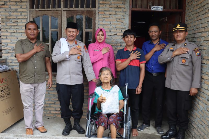 Dairi24jam || Kalang Simbara— Kapolres Dairi AKBP Wahyudi Rahman,SH, SIK, MM didampingi Ketua Bhayangkara Cabang Dairi, Ny Astri Wahyudi Rahman memberikan bantuan tali asih dan kursi roda kepada warga kurang mampu yang menderita penyakit lumpuh.