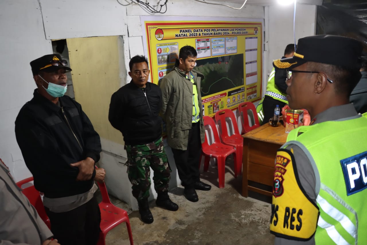 Dairi24jam || Sidikalang—Kapolres Dairi, AKBP Agus Bahari P.A, S.I.K, SH, M.Si melakukan pengecekan terhadap pos pengamanan dan pos pelayanan yang berada di wilayah Kabupaten Dairi, Senin (25/12/2023) dini hari pukul 01.00 WIB.