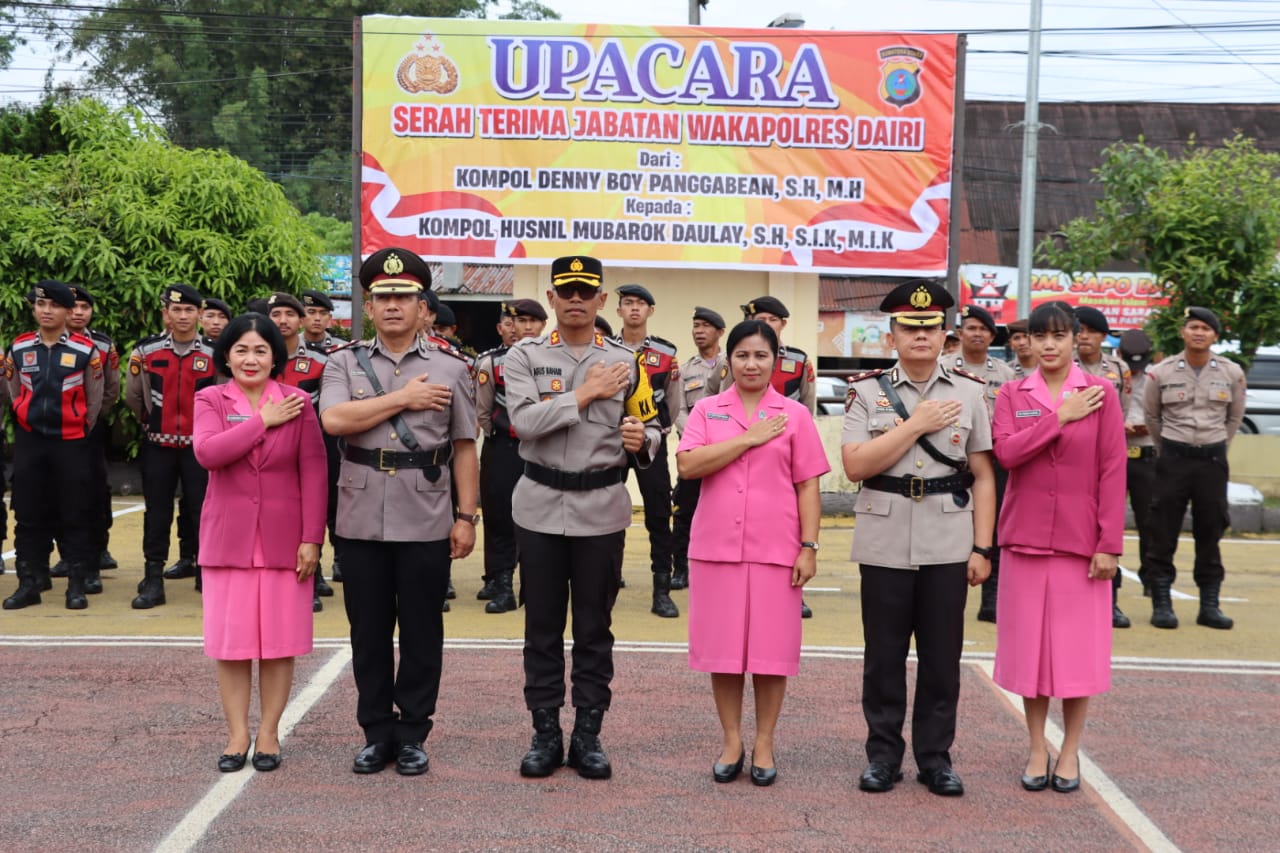 Dairi24jam || SidikalangKapolres Dairi, AKBP Agus Bahari memimpin upacara serah terima jabatan Wakapolres Dairi dari Kompol Deny Boy Panggabean, SH, MH kepada Kompol Husnil Mubarok Daulay, SH, SIK, M.I.K di halaman Mapolres Dairi, Selasa (2/4/2024).