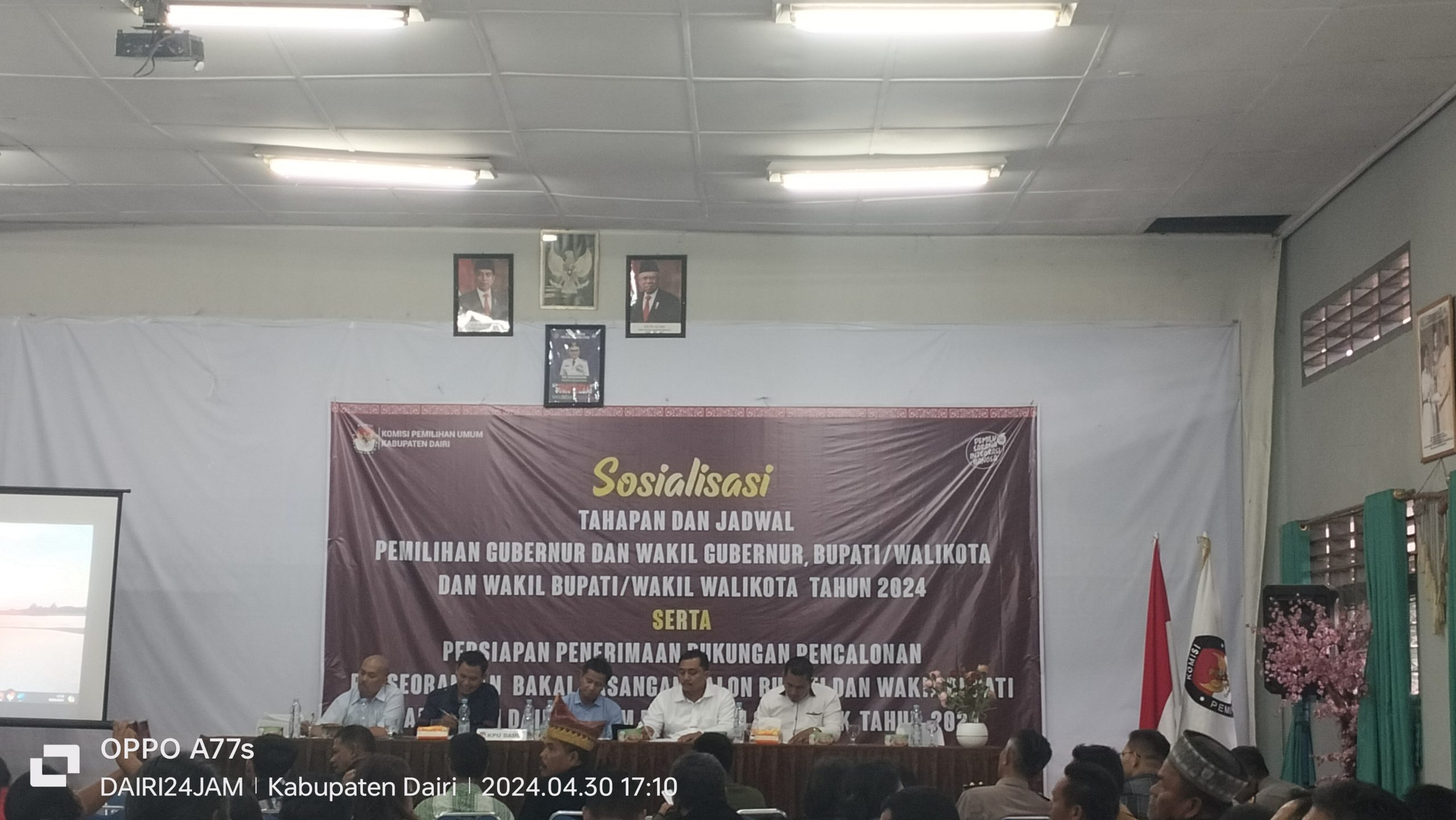 Dairi24jam|| Sidikalang—Komisi Pemilihan Umum Kabupaten Dairi sosialisasikan tahapan dan jadwal pemilihan gubernur dan wakil gubernur, bupati dan wakil bupati, serta walikota dan wakil walikota tahun 2024. Demikian juga persiapan penerimaan dukungan pencalonan perseorangan bakal pasangan calon bupati (Cabup) dan calon wakil bupati, Kabupaten Dairi Selasa (30/4/2024).
