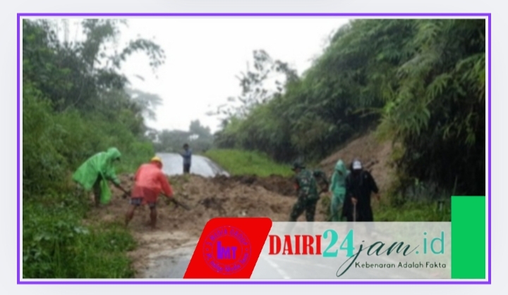DAIRI24JAM || Pakpak BharatAkibat hujan deras intensitas tinggi mengakibat kan longsor hingga menimpa ruas jalan, Babinsa koramil 06/Kerajaan Sertu Lumban Batu bersama warga setempat melaksanakan kegiatan karya bakti pembersihan longsoran sisa material yang menimbun Badan Jalan di Desa Kuta Jungak, Kecamatan Siempat Rube, Kabupaten Pakpak Bharat-Sumut. , Rabu (26-11-2025).