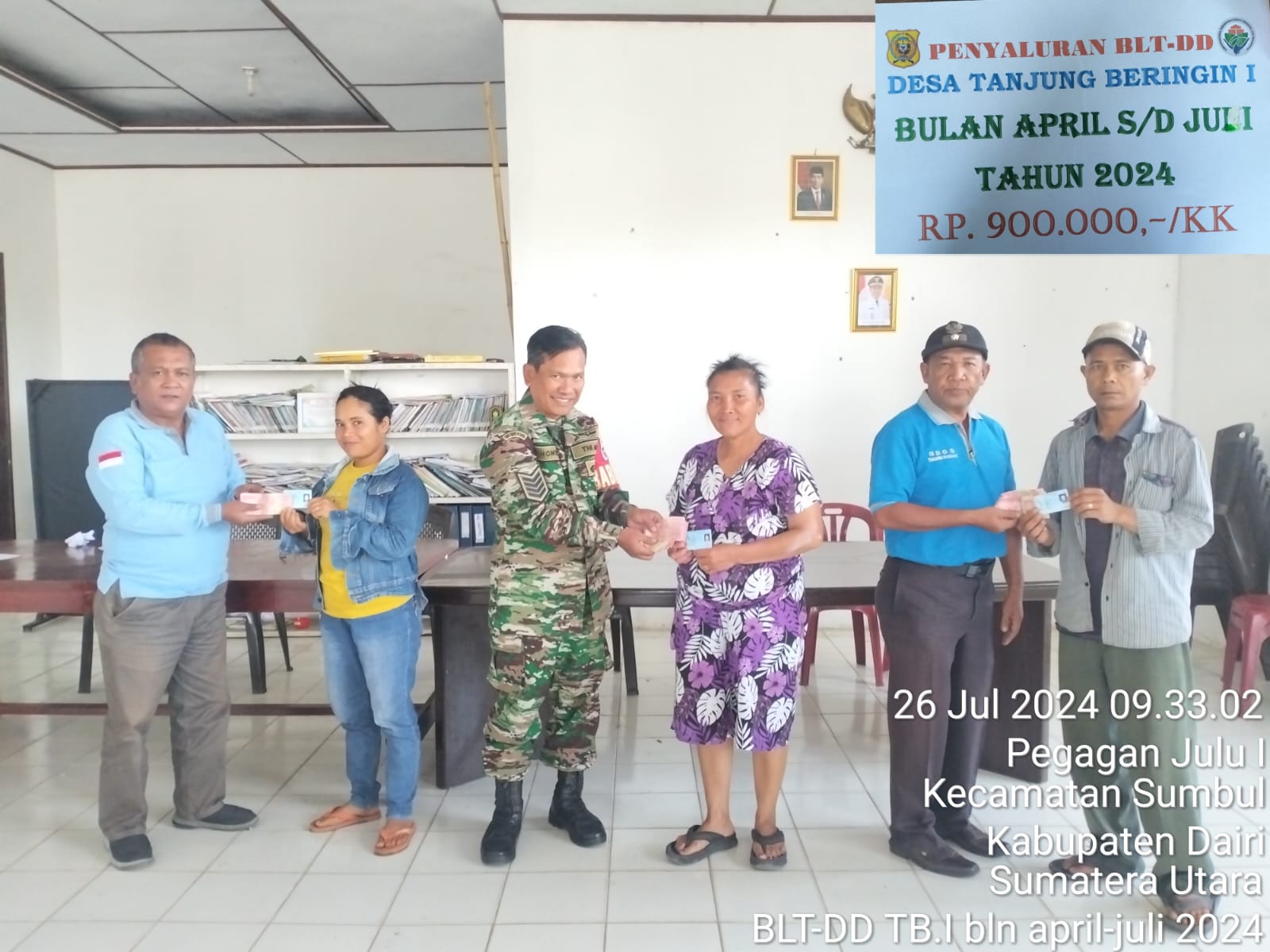 Dairi24jam || Sumbul – Babinsa Koramil 01/Sbl Kodim 0206/Dairi Serka Walbert Sihombing menghadiri sekaligus melaksanakan pengawalan dan pendampingan penyaluran Bantuan Langsung Tunai Dana Desa (BLT DD) bertempat di kantor Desa Tanjung beringin 1 Kecamatan Sumbul Kabupaten Dairi Jumat (26/07/2024) .