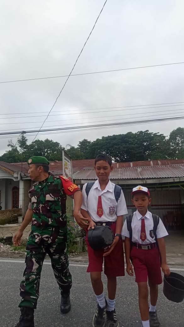 Peduli Keselamatan,Babinsa Bantu Menyeberangkan Anak Sekolah