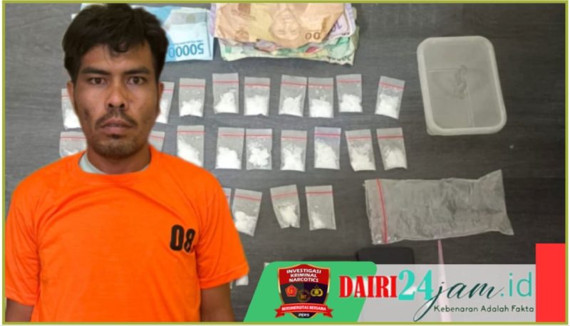 Dairi24jam | Dairi – Sat Narkoba Polres Dairi meringkus seorang terduga bandar narkoba berinisial MT (32) atas kepemilikan puluhan paket berisikan sabu di kediamannya Desa Balan II, Kecamatan Tanah Pinem Kabupaten Dairi – Sumut, Selasa (19/11/2024).