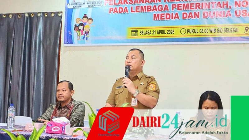 DAIRI24JAM || PANJI– Pemerintah Kabupaten Dairi terus menunjukkan komitmennya dalam mewujudkan perlindungan dan pemenuhan hak anak melalui kegiatan advokasi dan sosialisasi kebijakan kepada lembaga non-pemerintah, media, serta dunia usaha yang digelar oleh Dinas Pemberdayan Perempuan, Perlindungan Anak, Pengendalian Penduduk dan Keluarga Berencana (P3AP2KB) di Aula Hotel Beristra, Selasa (21/4/2026).