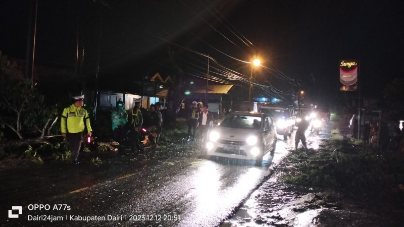 Dairi24jam || Sitinjo--Akibat hujan deras disertai angin kencang, arus lalu lintas di Kelurahan Panji Bako terlihat macat karena disebabkan adanya pohon yang tumbang.,Selasa (12-12-2023)..
