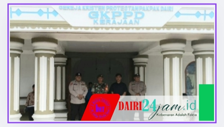DAIRI24JAM—Memberikan rasa aman dan nyaman bagi Umat Kristiani, Serda Rudy Limbong Babinsa Koramil 06/Kerajaan bersama Bhabinkamtibmas melaksanakan pengamanan di Gereja GKPPD yang berada di Desa Sukaramai, Kecamatan Kerajaan, Kabupaten Pakpak Bharat, Minggu (24-08-2025)..