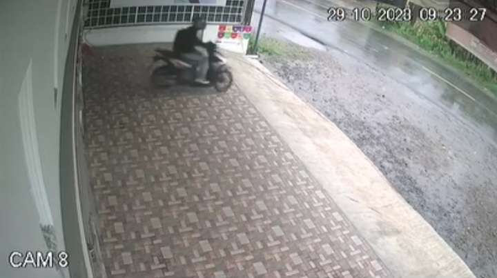 Video dari rekaman CCTV itu berdurasi 1 menit 22 detik. Terlihat seorang pria yang mengendarai sepeda motor datang ke bagian teras toko warga.