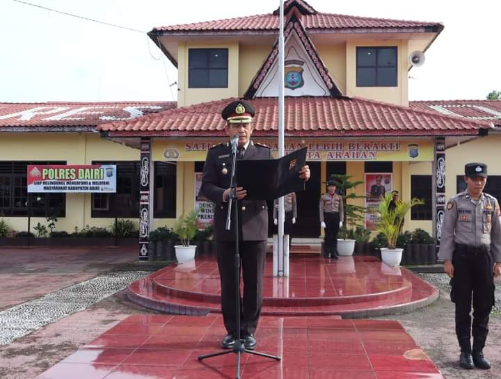 Yang mana dalam pelaksanaan Upacara tersebut Wakapolres Dairi Kompol Denny Boy P. SH, MH menjadi selaku Inspektur Upacara, sedang perangkat Perwira Upacara Kasat Binmas Polres Dairi Iptu Sulthony Saragih, S.H dan Komandan Upacara KBO Sat Intelkam  Polres Dairi Iptu Hotdiman Hutasoit.