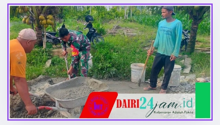 DAIRI24JAMWujud kebersamaan dan berperan aktif mengatasi kesulitan rakyat di wilayah binaan dituangkan oleh Serma S.Umri Babinsa Koramil 05/Tanah Pinem dengan melibatkan diri secara langsung dalam pelaksanaan Gotong Royong membangun Rumah milik salah satu warga desa binaan , di Desa Liang Jering, Kecamatan Tanah Pinem, Kabupaten Dairi-Sumut, Jumat (18-04-2025).